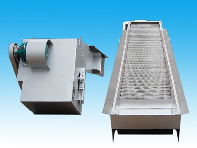 本設(shè)備斜置于污水通道中,與地面傾斜75°,柵條與機架固定為一體,柵條用于攔截污水中的污物,機架兩側(cè)設(shè)有鏈條導(dǎo)軌,用于支撐傳動鏈條,傳動鏈條間固定6組除污耙,耙齒伸入柵條縫隙之中;由驅(qū)動電機帶動減速機,減速機帶動鏈條做回轉(zhuǎn)運動,通過鏈條的回轉(zhuǎn)帶動除污耙完成除渣動作。該設(shè)備主要由格柵傳動裝置、框架、除污耙、撇渣裝置、電器控制等幾部分組成。